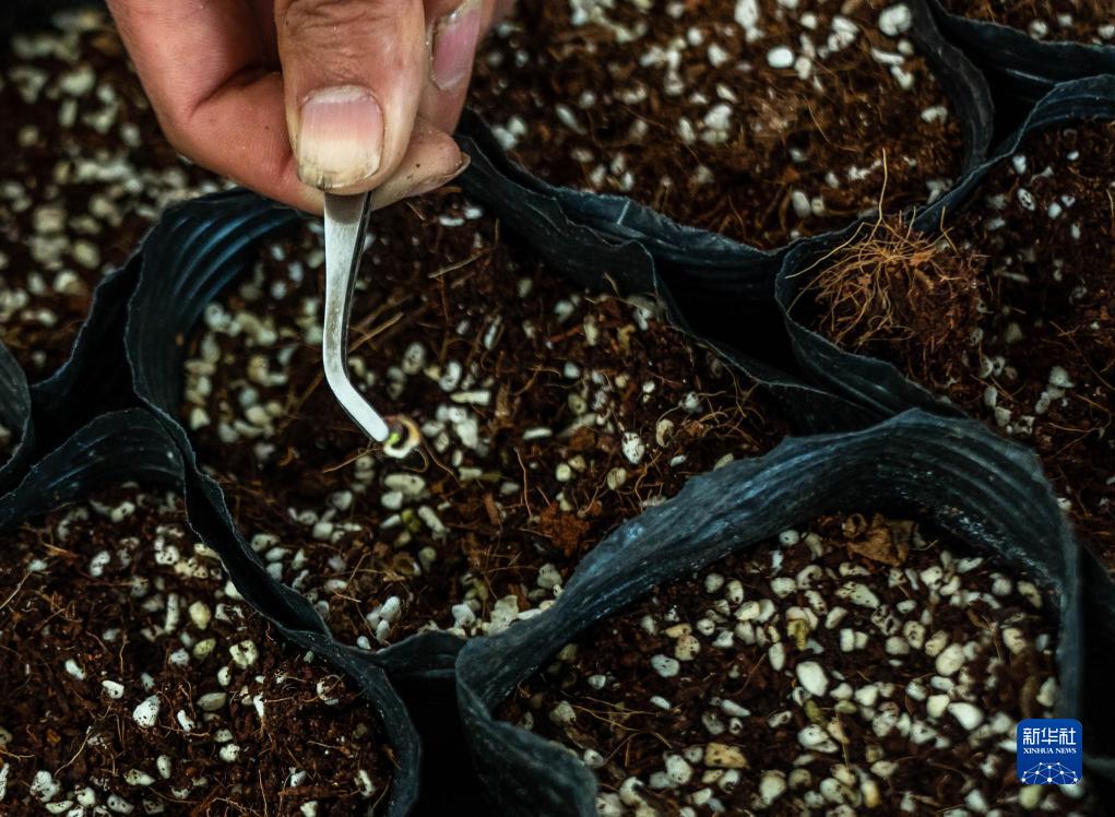 云南錦科花卉工程研究中心里已經發芽的太空種子(4月3日攝)。