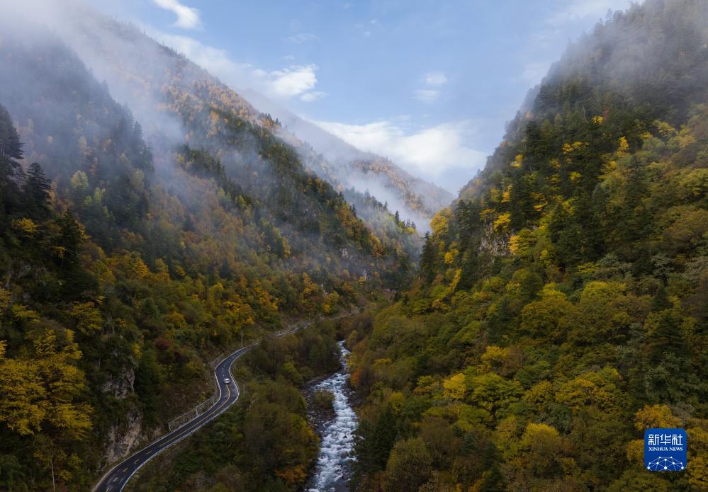 前往黨嶺村的鄉(xiāng)村旅游公路蜿蜒在高山峽谷中(10月27日攝,無人機(jī)照片)。