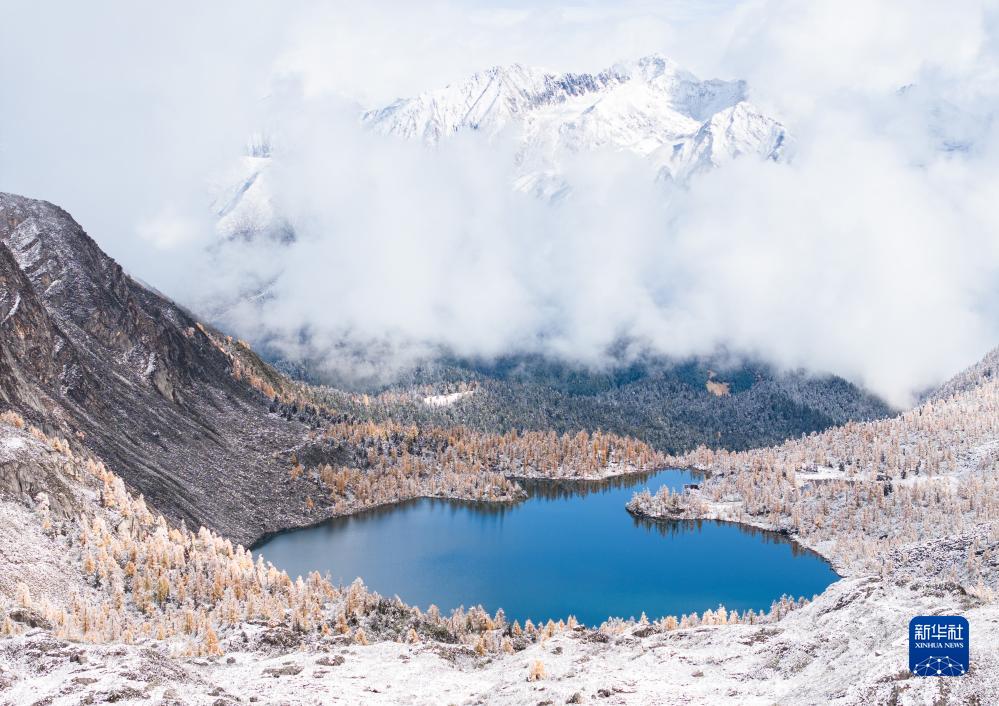 雪山、黨嶺村葫蘆海、彩林構成一幅優美的畫卷(10月27日攝,無人機照片)。