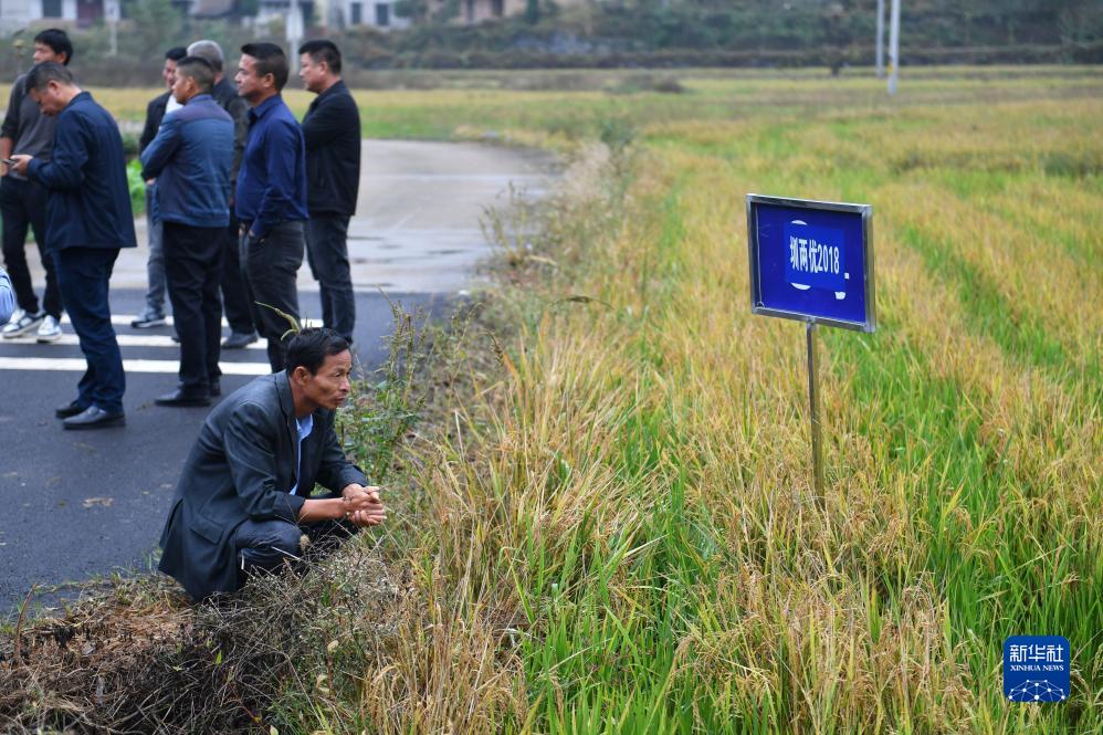10月28日,在婁底市雙峰縣石牛鄉(xiāng)上茶村,種糧大戶們觀摩不同品種的再生稻。