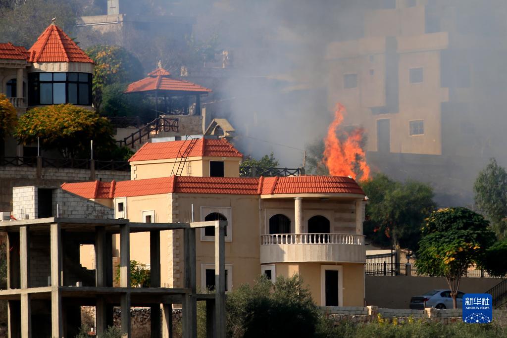 10月28日,在黎巴嫩邁斯杰貝勒,一處居民區遭炮擊后起火。