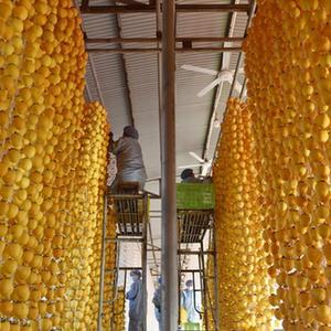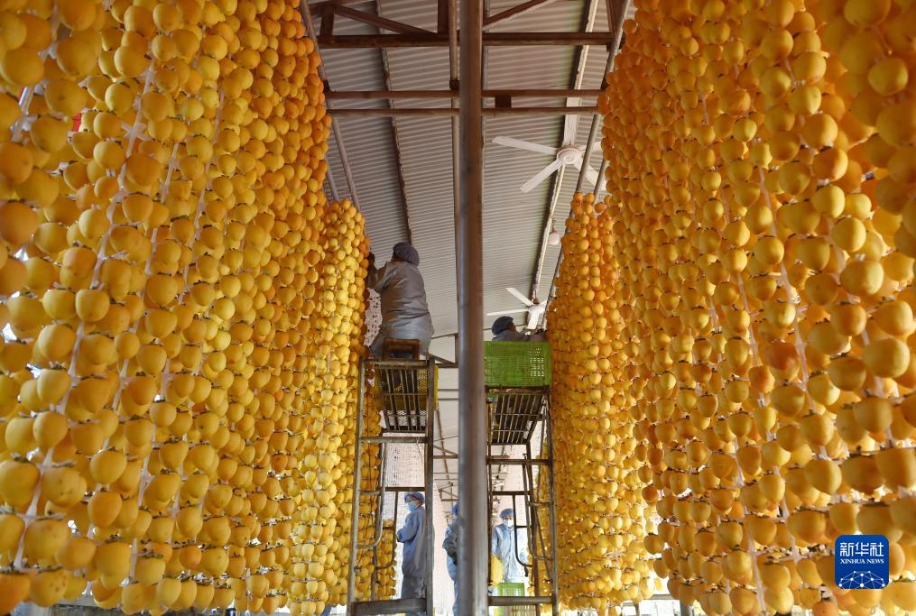 10月28日,村民在禹州市磨街鄉劉門村的加工廠里吊掛柿子,準備制作柿餅。