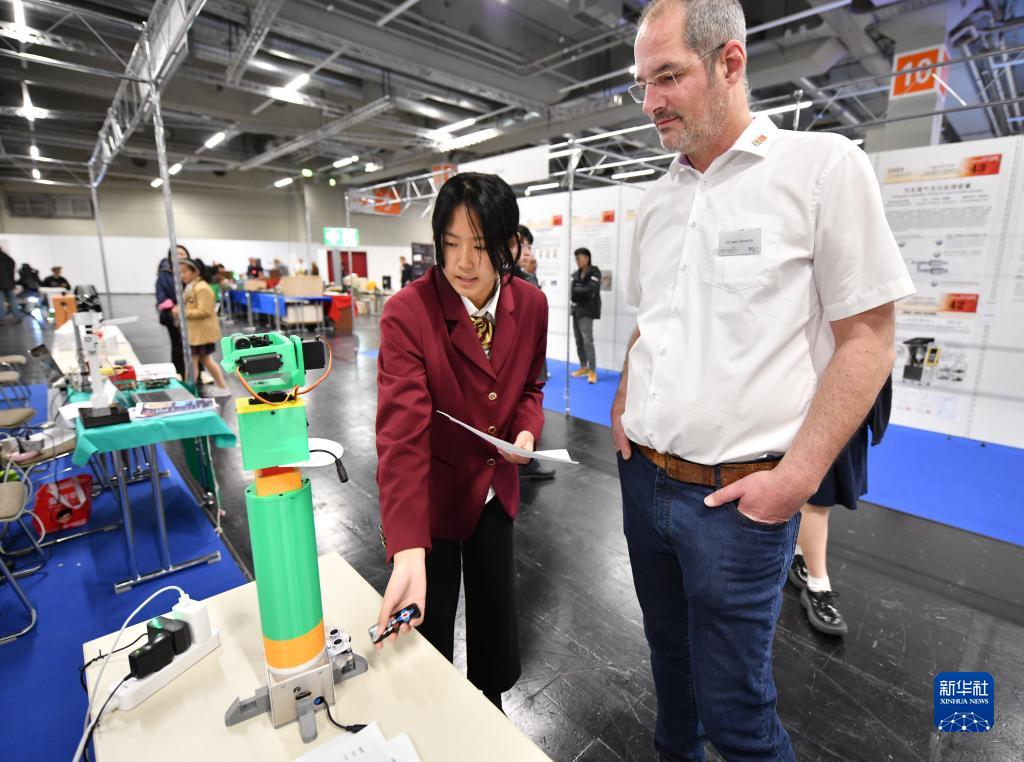 10月28日,在德國紐倫堡,一名北京市第八十中學的學生向參觀者介紹一款自穩定三腳架模型。
