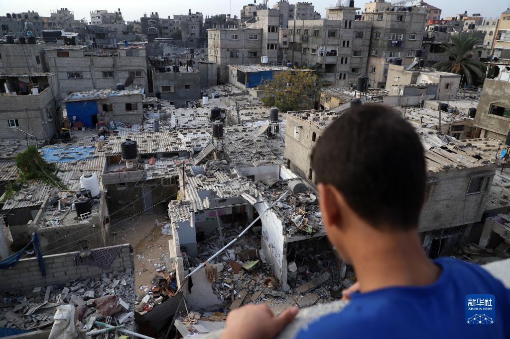 10月29日,在加沙地帶南部城市汗尤尼斯,一名兒童看向遭以色列襲擊損毀的建筑。