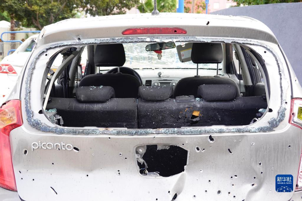 這是10月29日在以色列南部城市阿什杜德拍攝的遭火箭彈襲擊的車輛。