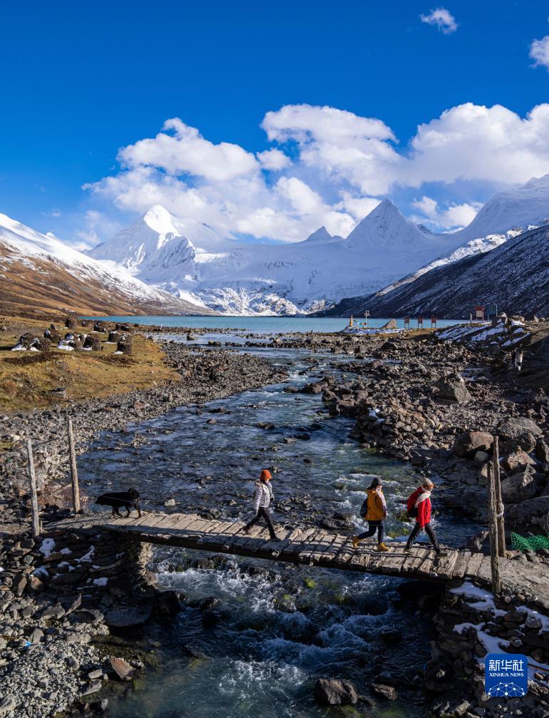 游客徒步經過薩普雪山腳下的木橋(10月28日攝)。