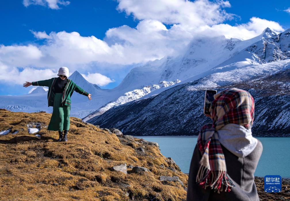 游客在薩普雪山腳下拍照留念(10月28日攝)。