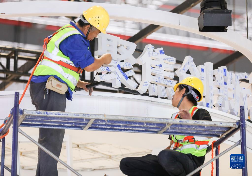 工作人員在國(guó)家會(huì)展中心(上海)內(nèi)部布展施工(10月29日攝)。