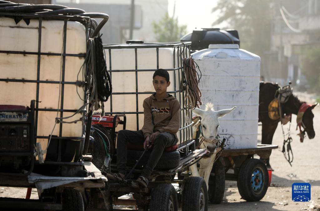 10月30日,因缺乏燃料,人們在加沙地帶南部城市汗尤尼斯使用畜力車運輸飲用水。