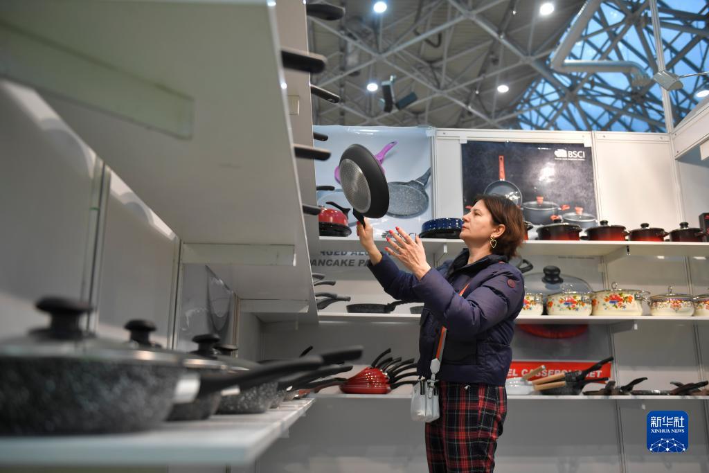 10月30日,在俄羅斯首都莫斯科,一名女子在中國消費品(俄羅斯)品牌展覽會上查看展出的鍋具。