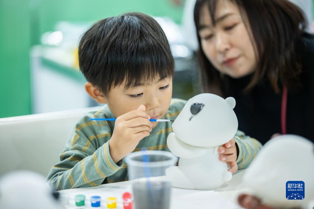 10月28日,一名兒童在日本大阪國際會展中心中國館體驗為熊貓玩偶上色。
