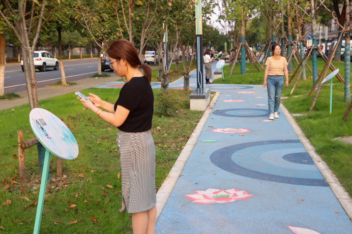 2023年10月30日,市民在江蘇省無錫市梁溪區(qū)廣益街道毛岸新苑社區(qū)蓮花步道掃碼聽家風(fēng)故事。
