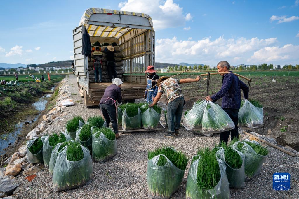 10月30日,農民在魯甸縣一處香蔥種植基地內將香蔥稱重裝車。