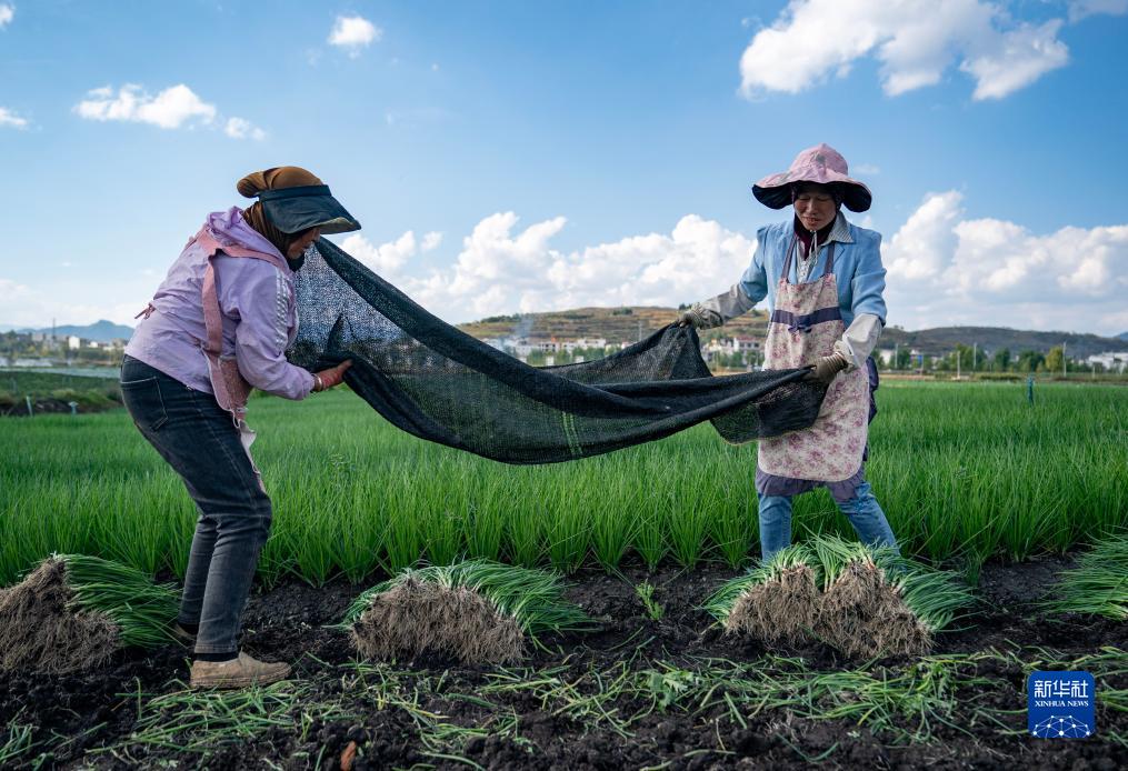 10月30日,農民在魯甸縣一處香蔥種植基地內為剛采收的香蔥蓋遮陽布。