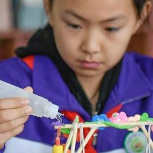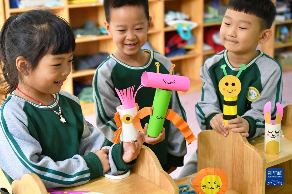10月31日,山東省煙臺市福山區(qū)未來之星幼兒園的小朋友利用廢舊物品制作手工藝品。