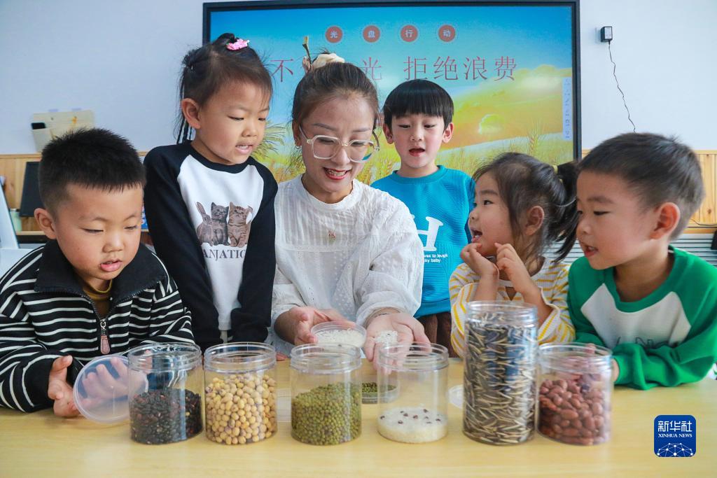 10月31日,在山東省高密市鳳鳴實(shí)驗(yàn)幼兒園,孩子們在老師指導(dǎo)下認(rèn)識糧食。