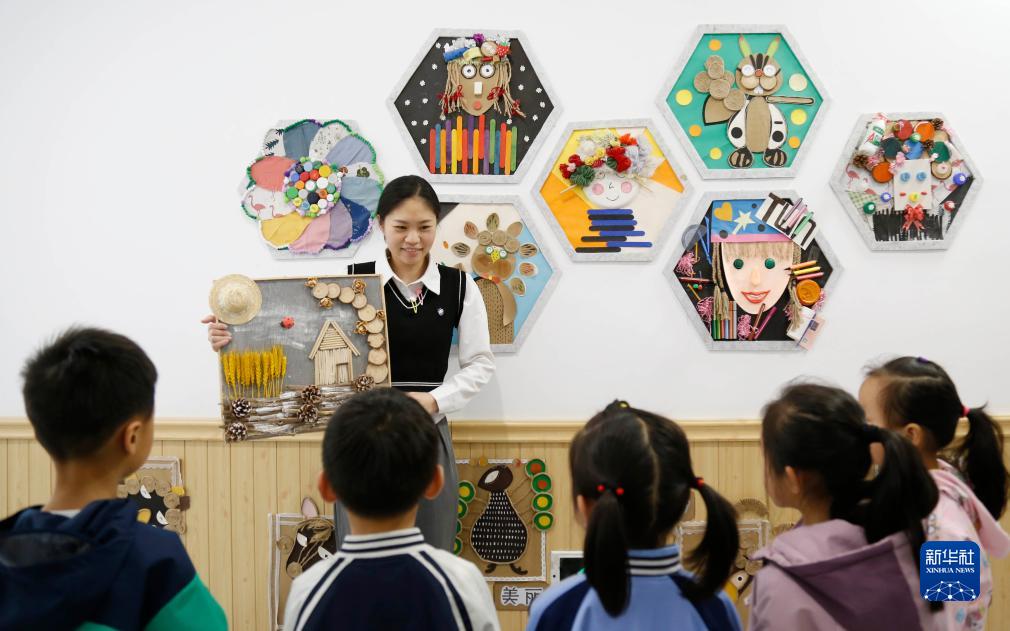 10月31日,河北省邢臺市南和區第一幼兒園的老師向小朋友展示用廢棄材料制作的手工作品。