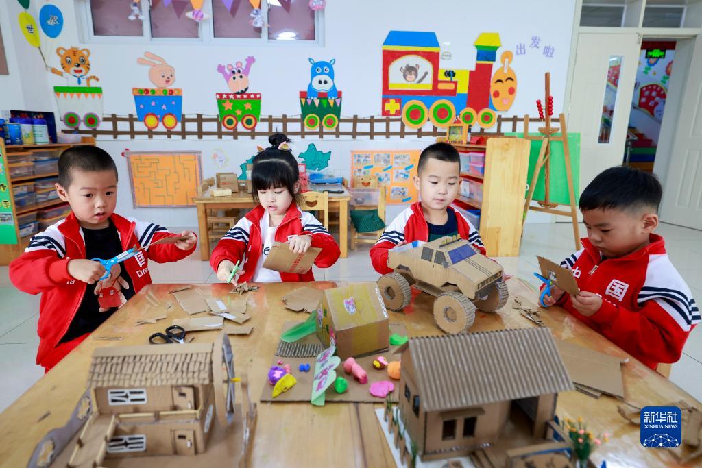 10月31日,河北省唐山市豐南區(qū)群立幼兒園的孩子用廢紙殼制作手工藝品。