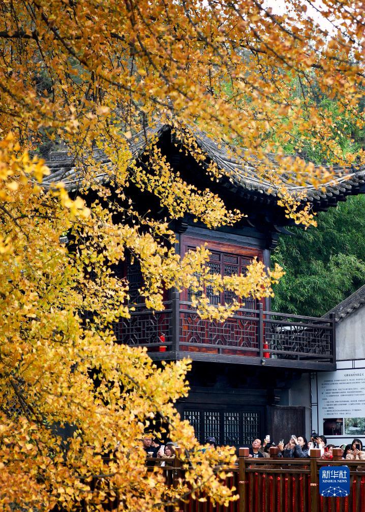 深秋時節,陜西省西安市長安區終南山古觀音禪寺內的千年銀杏滿目金黃,吸引游客參觀游覽。