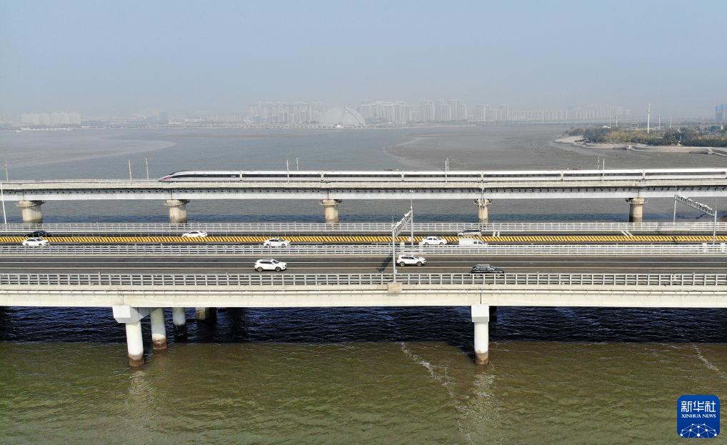 車輛從青蘭高速女姑口跨海特大橋(前)上駛過(10月31日攝,無人機照片)。
