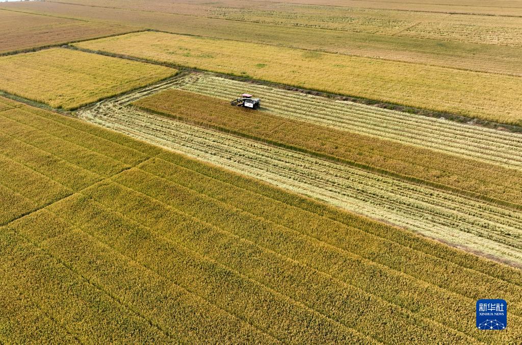 10月30日,在江蘇省連云港市大新農(nóng)場(chǎng),收割機(jī)搶收耐鹽堿水稻(無(wú)人機(jī)照片)。
