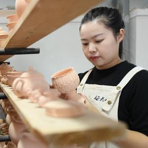“95后”陶瓷夫妻檔季雙俊和季資美是高中和大學時的同學,因為共同的興趣走到一起。從景德鎮陶瓷工藝美院畢業后回到故鄉龍泉,夫妻二人在甌江旁的爐田村駐扎下來,成立了“梅夫人”工作室,潛心鉆研北宋風格的青瓷器。兩人從古瓷中尋找靈感,力圖重現北宋龍泉窯的胎釉特點,并借鑒青銅器、金銀器、古代服裝上的紋樣,在瓷上傾注對傳統文化的熱愛。