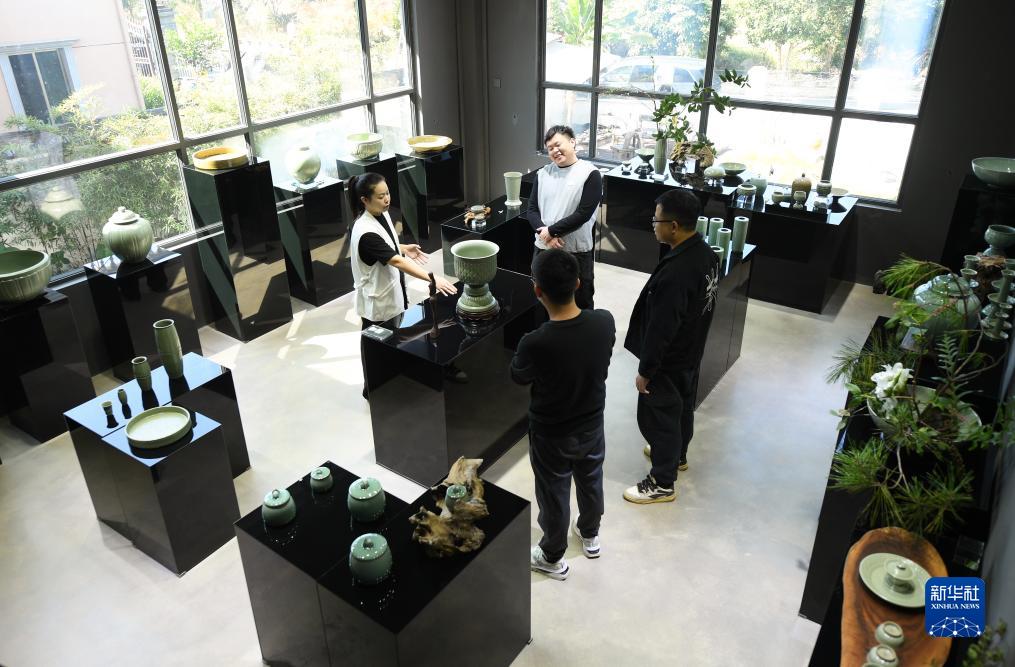 10月31日,在“梅夫人”工作室,季資美(左一)向來訪的陶藝家朋友介紹自己燒制的蓮瓣紋香爐。