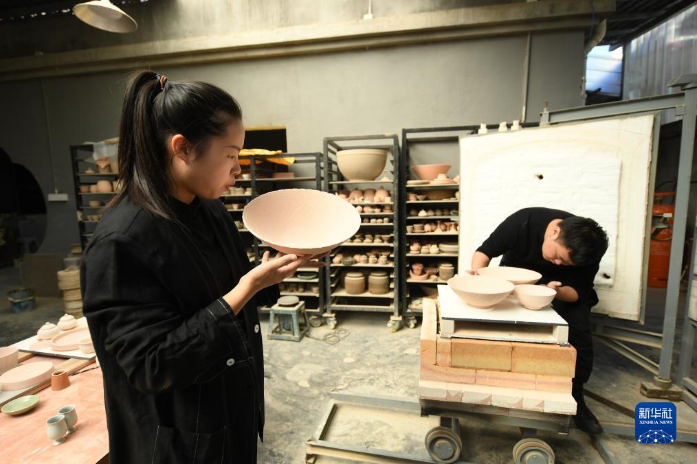 10月31日,在“梅夫人”工作室,季資美吹去瓷坯上的灰塵,準(zhǔn)備裝窯燒制。
