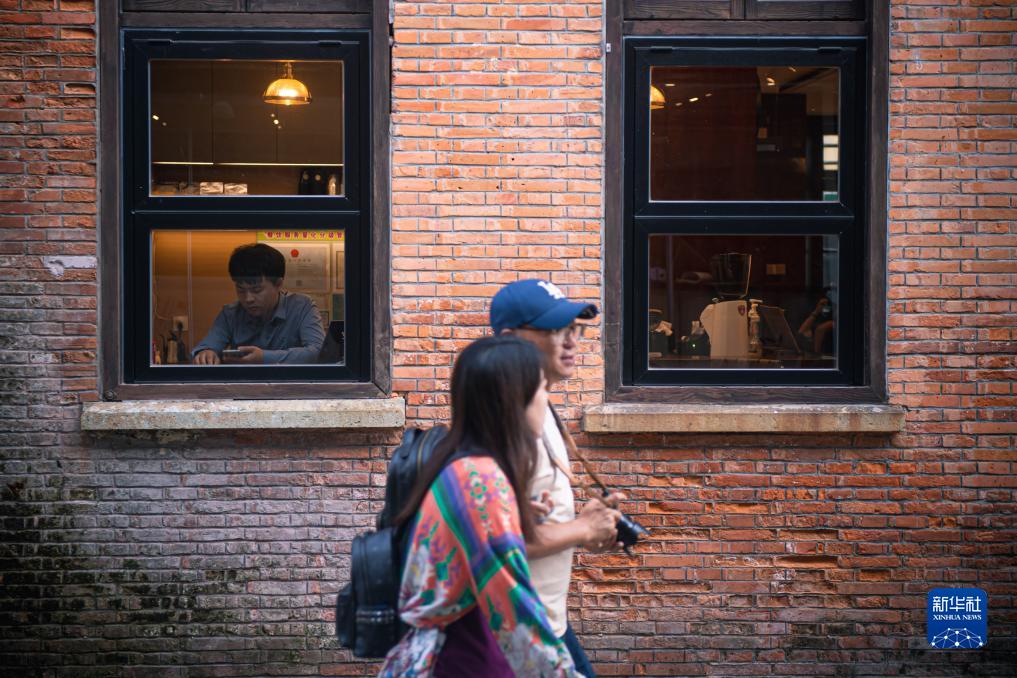 10月31日,游客經(jīng)過寧波老外灘步行街一處由歷史建筑改造而成的咖啡廳。