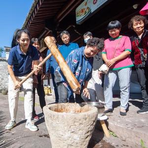 11月1日,游客在慈城古縣城景區內體驗水磨年糕手工制作技藝。