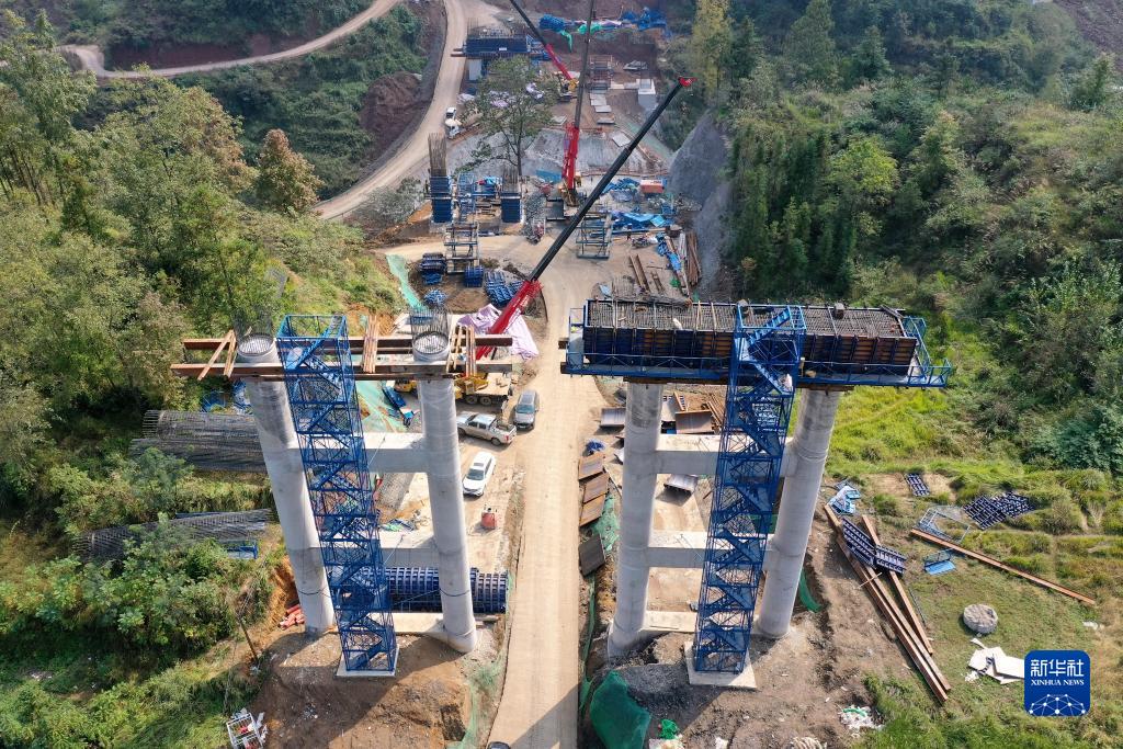 11月1日,正在進行橋墩施工的老猴沖大橋(無人機照片)。