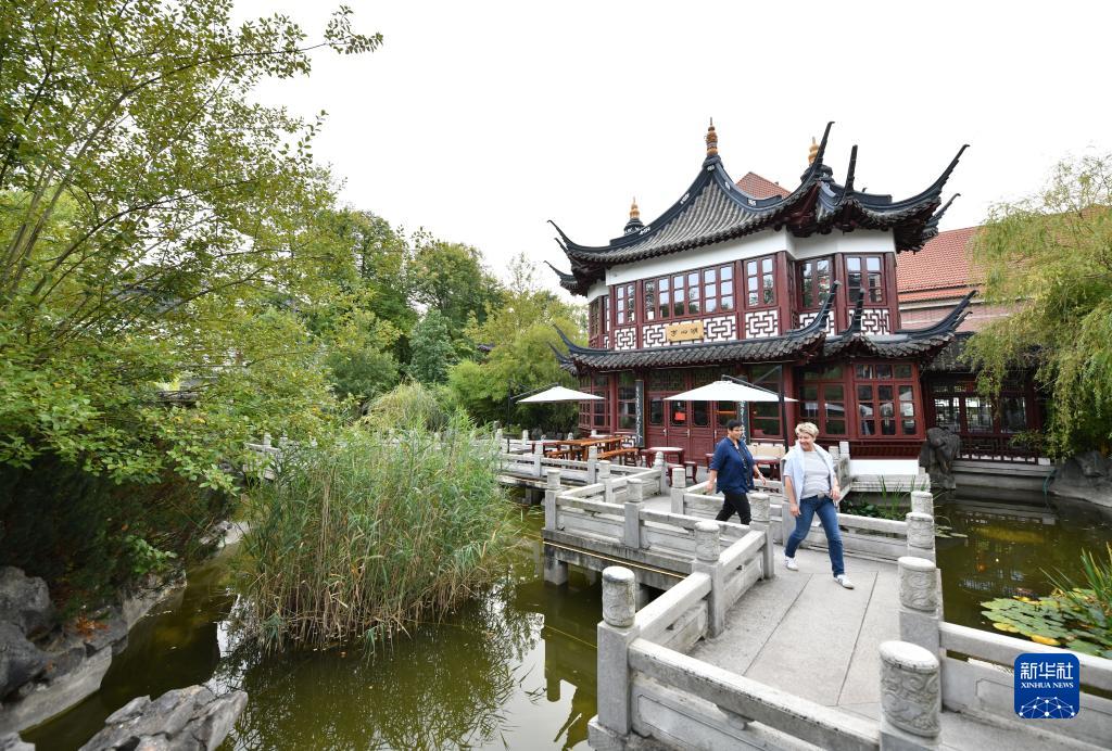 9月28日,人們行走在德國(guó)漢堡豫園九曲橋上。