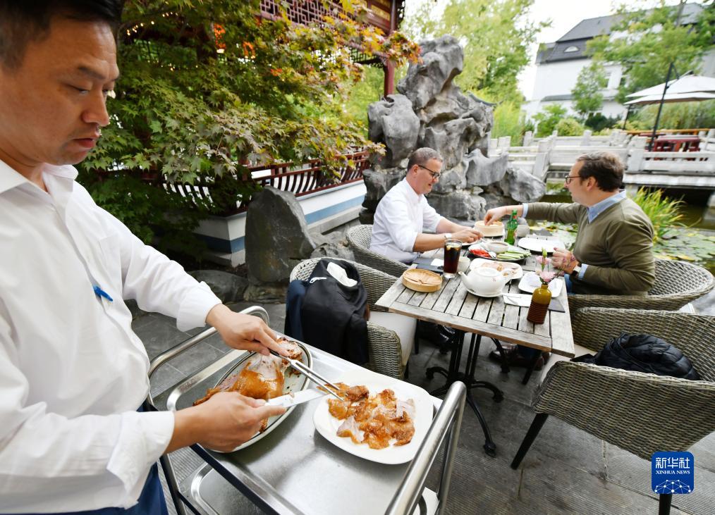 9月28日,德國漢堡豫園餐廳工作人員為顧客片烤鴨。