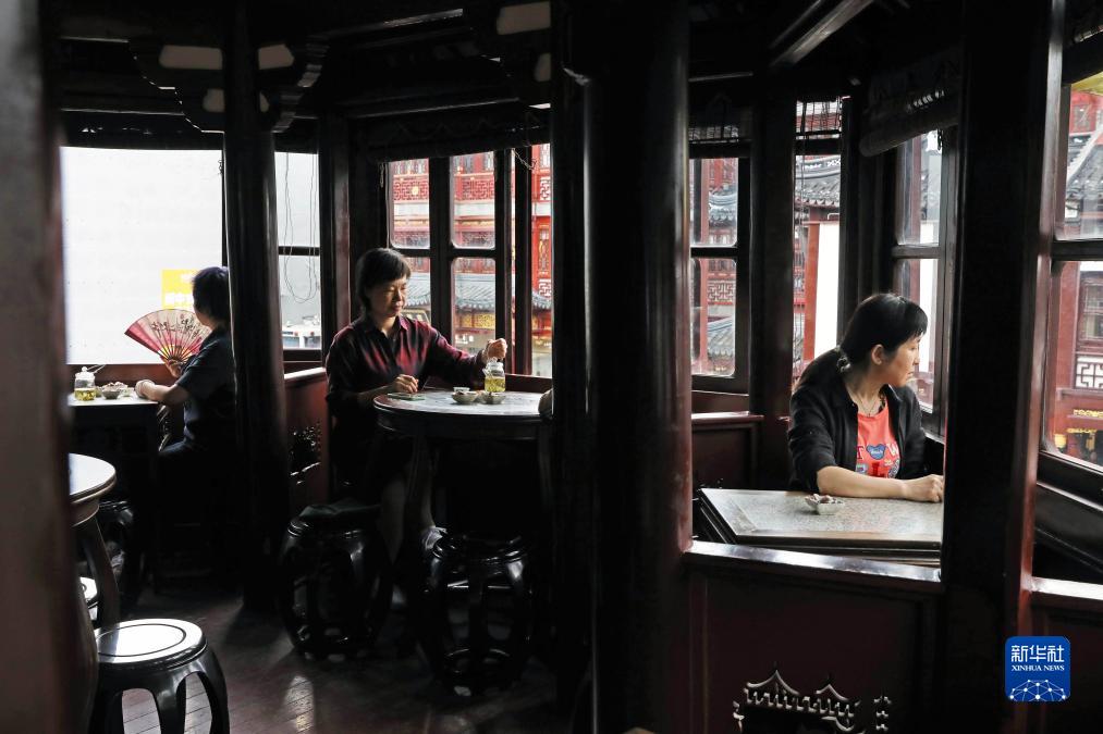 10月12日,人們在上海豫園的九曲橋湖心亭茶樓喝茶。湖心亭茶樓是上海現存最古老的茶樓。