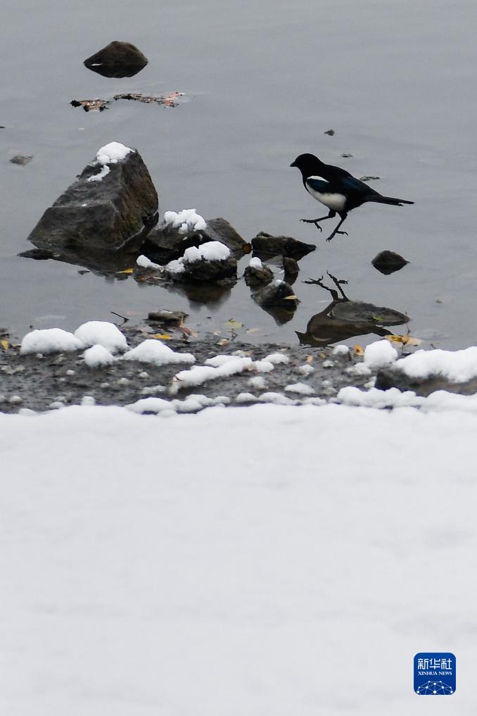 11月1日,在吉林長(zhǎng)春,一只小鳥(niǎo)在湖面積雪的石頭間跳躍。