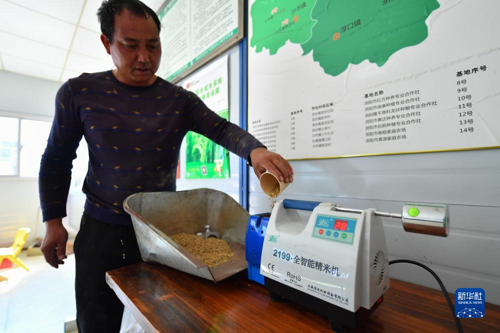 11月1日,在湖南省瀏陽市龍伏鎮龍伏村,工作人員使用全智能精米機檢測稻谷的出米情況。
