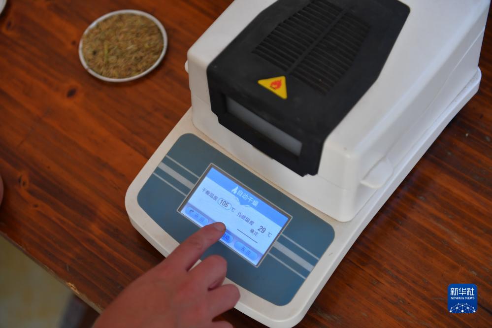 11月1日,在湖南省瀏陽市龍伏鎮龍伏村,工作人員使用自動快速水分測定儀檢測稻谷的含水量。
