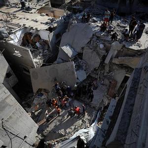 11月1日,在加沙地帶南部城市汗尤尼斯,人們在遭以色列襲擊后的建筑廢墟進行搜救工作。
