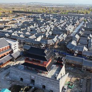 11月1日,工人在河北省張家口市萬全右衛城長城國家文化公園文旅融合區項目建設工地施工(無人機照片)。