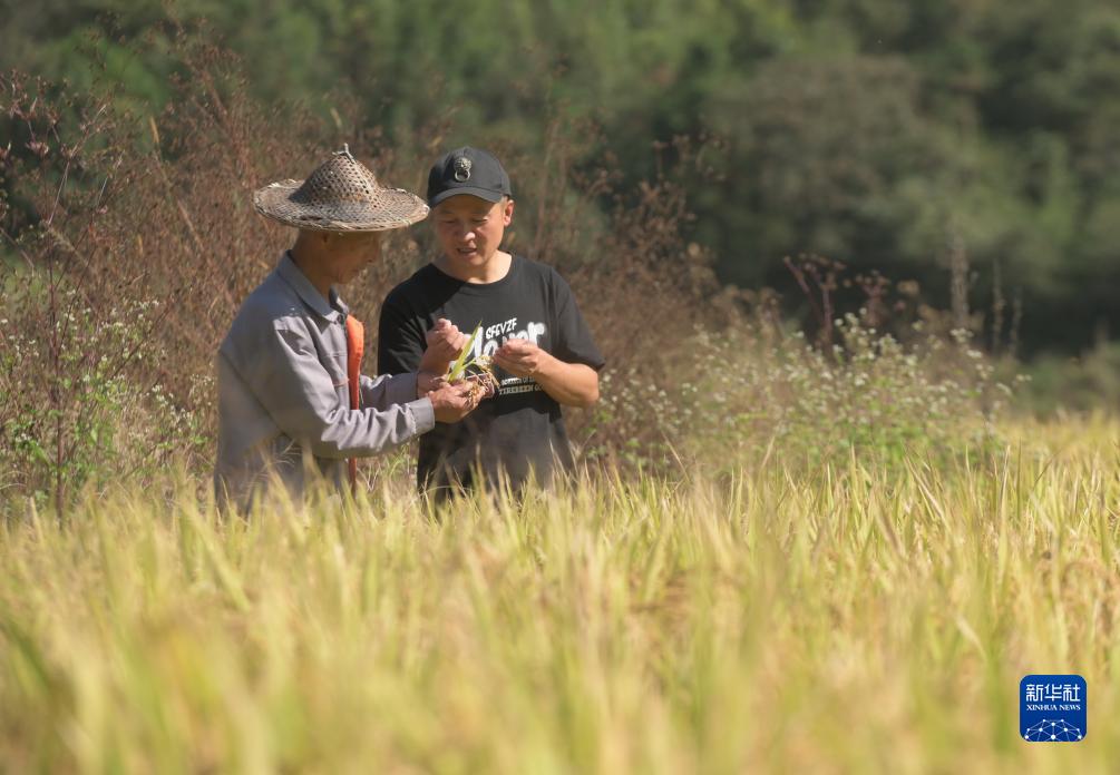 11月1日,李飛(右)和他的父親在水稻田里查看水稻的長勢。