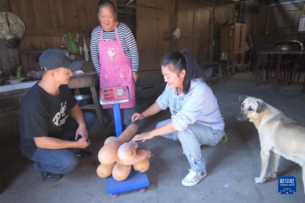 11月1日,李飛(左)和妻子(右)在村民家里收購(gòu)農(nóng)產(chǎn)品。