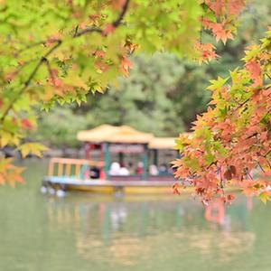 11月3日,游人在北京頤和園后湖乘船觀賞紅葉。