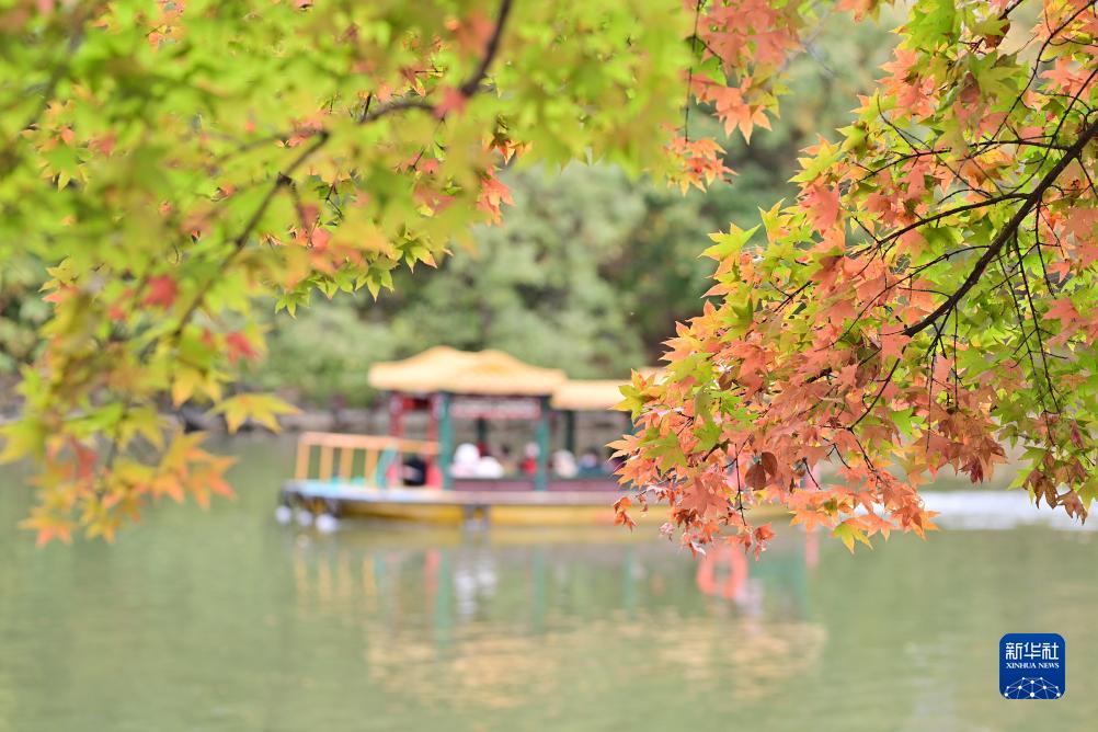 11月3日,游人在北京頤和園后湖乘船觀賞紅葉。