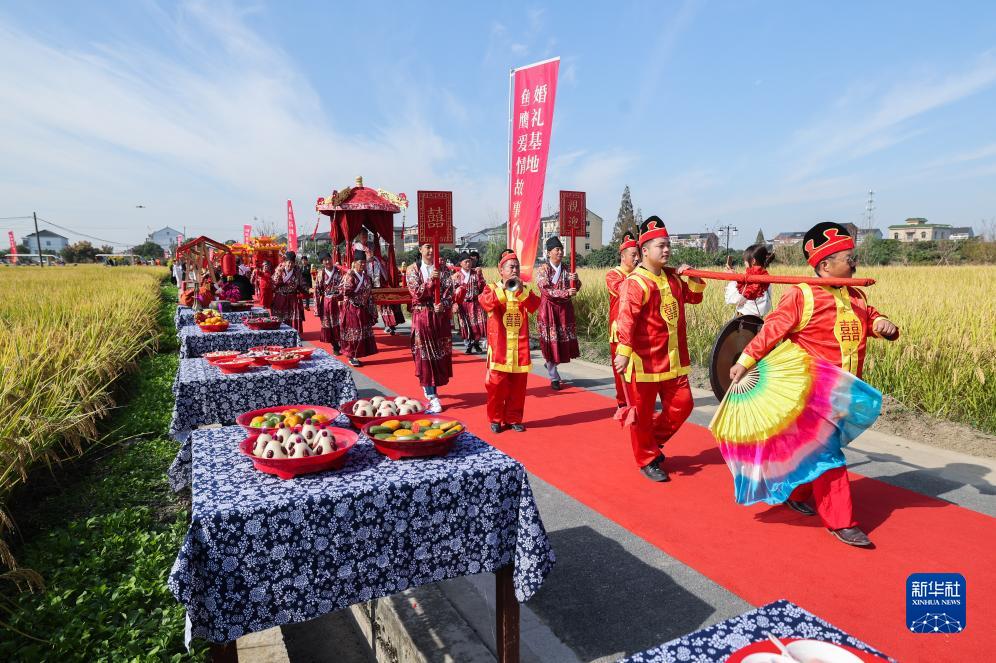 坐上大花轎、走過(guò)合歡橋、跨過(guò)紅火缸、同乘幸福船……11月3日,一場(chǎng)“良緣水鄉(xiāng)締 佳偶自天成”水鄉(xiāng)集體婚禮在浙江省杭州市臨平區(qū)塘棲鎮(zhèn)丁河村新建成的“丁山湖魚(yú)鷹愛(ài)情故事婚禮基地”舉行。八對(duì)新人在村民和游客的見(jiàn)證下喜結(jié)良緣,并發(fā)出《婚俗改革倡議書(shū)》,向廣大適婚青年傳播新時(shí)代的婚戀觀,倡導(dǎo)健康文明的嫁娶新風(fēng)尚。該婚禮基地依托水鄉(xiāng)風(fēng)貌,已成為當(dāng)?shù)靥厣l(xiāng)村文旅品牌。