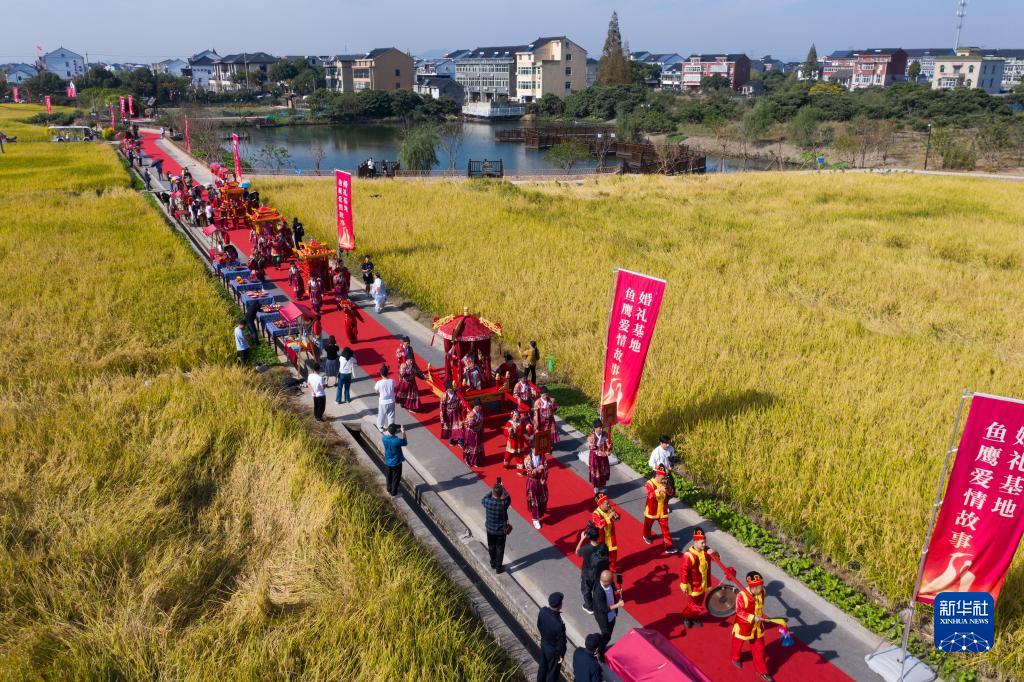 坐上大花轎、走過(guò)合歡橋、跨過(guò)紅火缸、同乘幸福船……11月3日,一場(chǎng)“良緣水鄉(xiāng)締 佳偶自天成”水鄉(xiāng)集體婚禮在浙江省杭州市臨平區(qū)塘棲鎮(zhèn)丁河村新建成的“丁山湖魚(yú)鷹愛(ài)情故事婚禮基地”舉行。八對(duì)新人在村民和游客的見(jiàn)證下喜結(jié)良緣,并發(fā)出《婚俗改革倡議書(shū)》,向廣大適婚青年傳播新時(shí)代的婚戀觀(guān),倡導(dǎo)健康文明的嫁娶新風(fēng)尚。該婚禮基地依托水鄉(xiāng)風(fēng)貌,已成為當(dāng)?shù)靥厣l(xiāng)村文旅品牌。