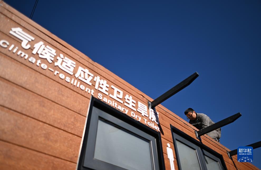 在青海省海東市平安區三合鎮幸福家園社區,一名施工人員在社區內安裝環保廁所(11月1日攝)。