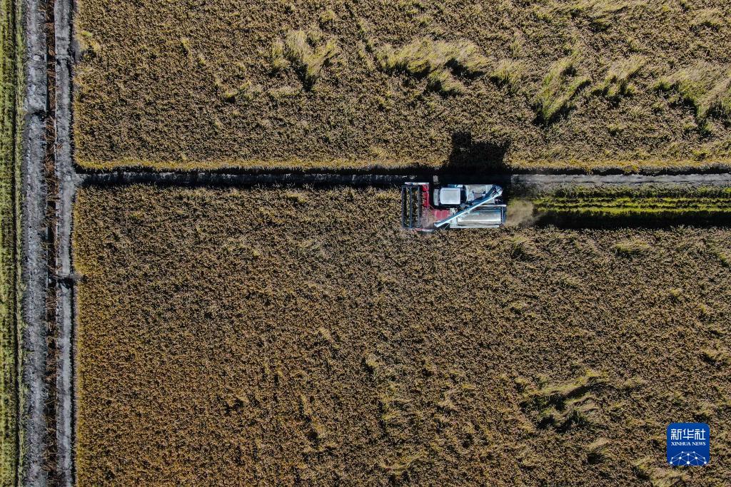 11月3日,農(nóng)戶駕駛農(nóng)業(yè)機械在盤錦市大洼區(qū)王家街道興海村收割水稻(無人機照片)。