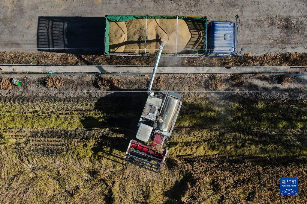 11月3日,農(nóng)戶在盤錦市大洼區(qū)王家街道興海村將收割的水稻裝車(無人機(jī)照片)。