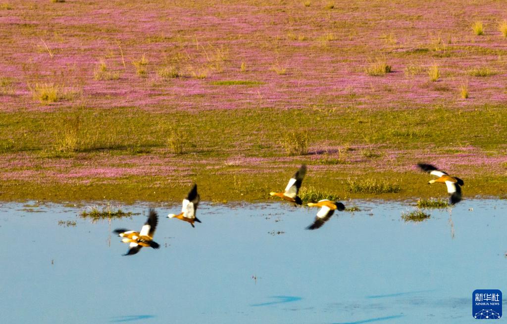 11月1日在江西鄱陽湖都昌濕地拍攝的蓼子花海(無人機照片)。