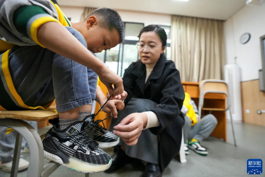 10月30日,在重慶市特殊教育中心的教室內,一名老師指導二年級視力障礙學生練習系鞋帶。